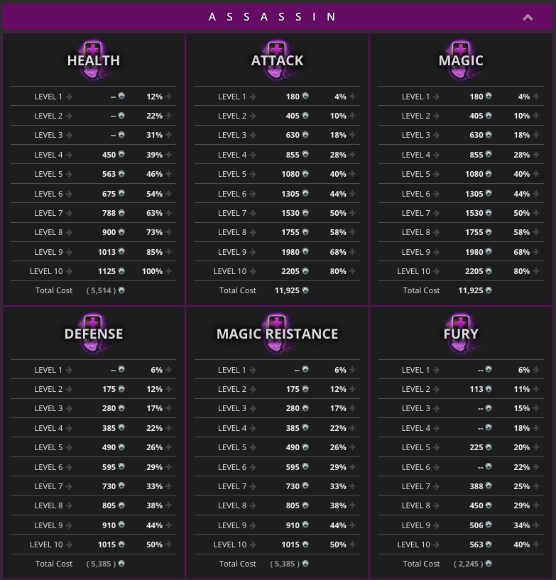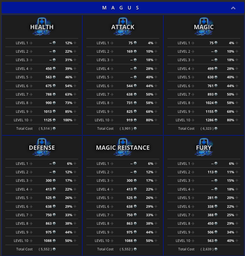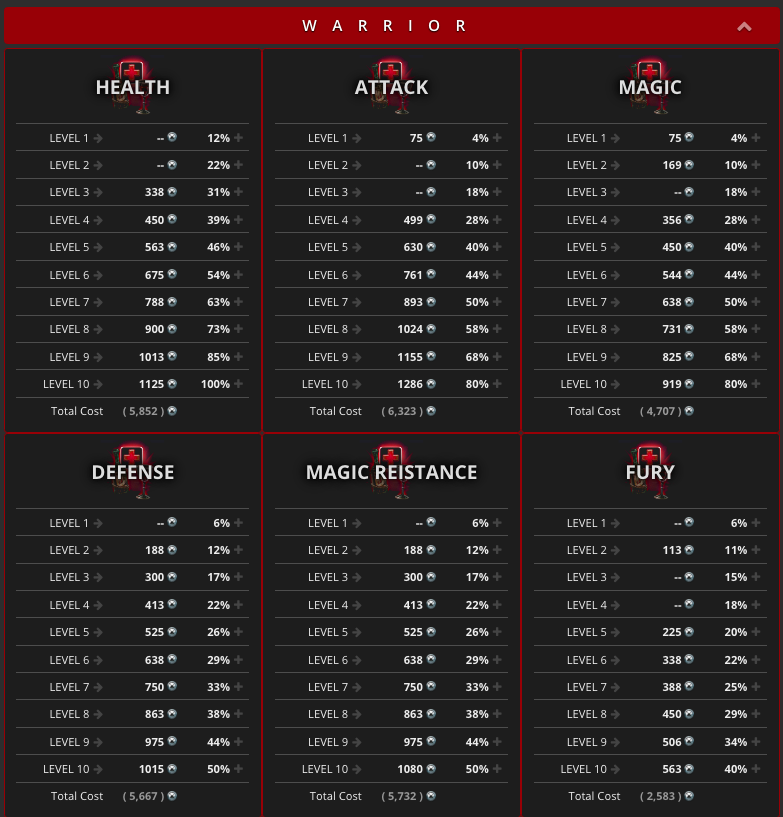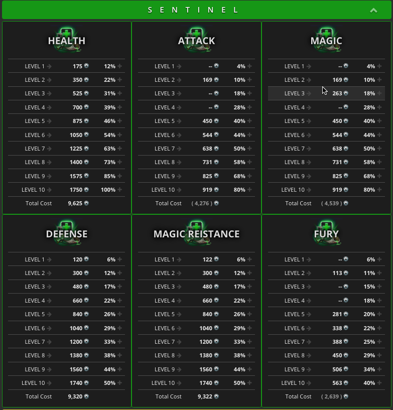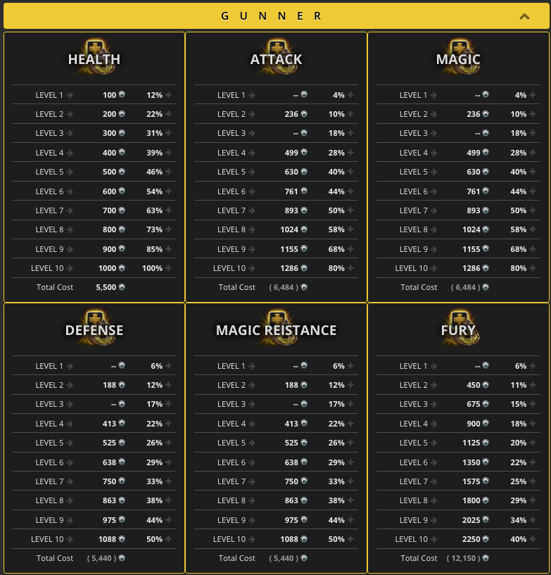 Notice that within a given category, the IC cost from one level to the next increases at a constant rate across all levels (except for rounding). Using that logic should allow you to fill in some gaps. For instance, Gunner Def and MR Level 3 would be 300, since the IC cost in those categories increases by 112.5 per level.