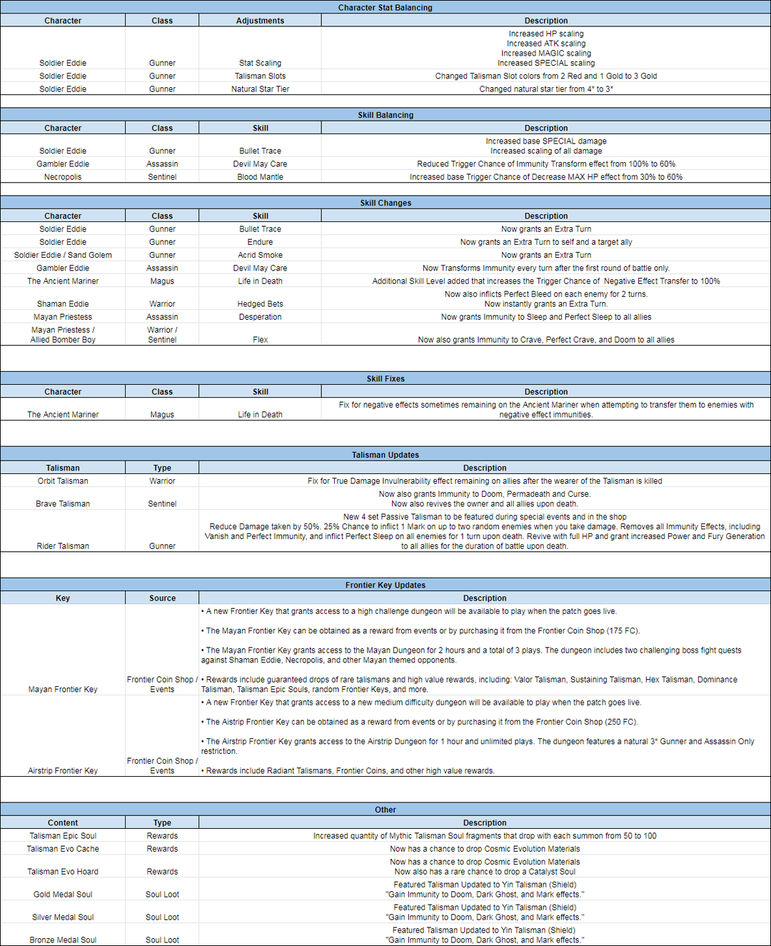 The following is the preliminary list of character and talisman tuning changes that will go live in an upcoming update.
