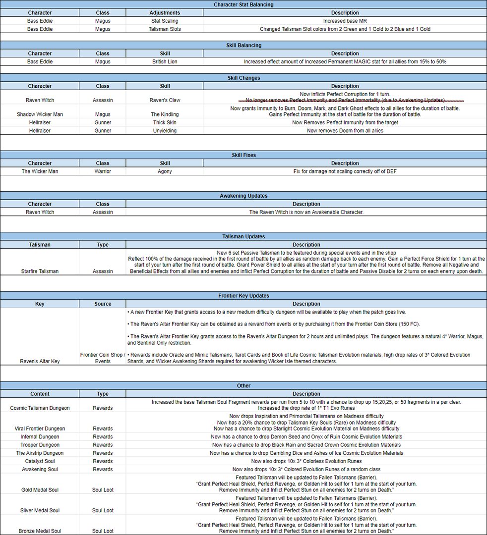 The following is the preliminary list of character and talisman tuning changes that will go live in an upcoming update.