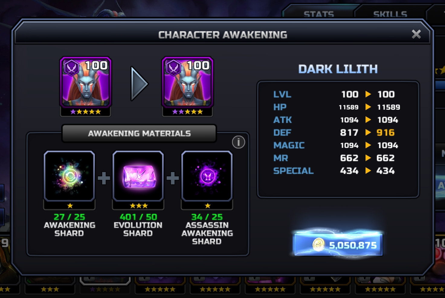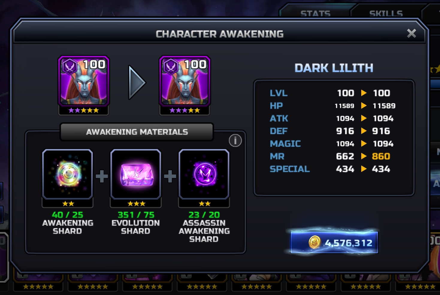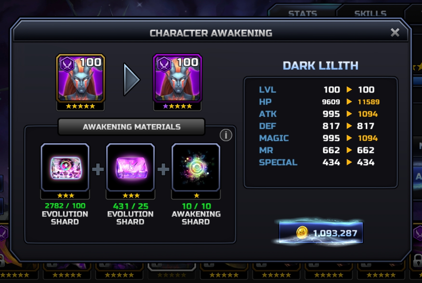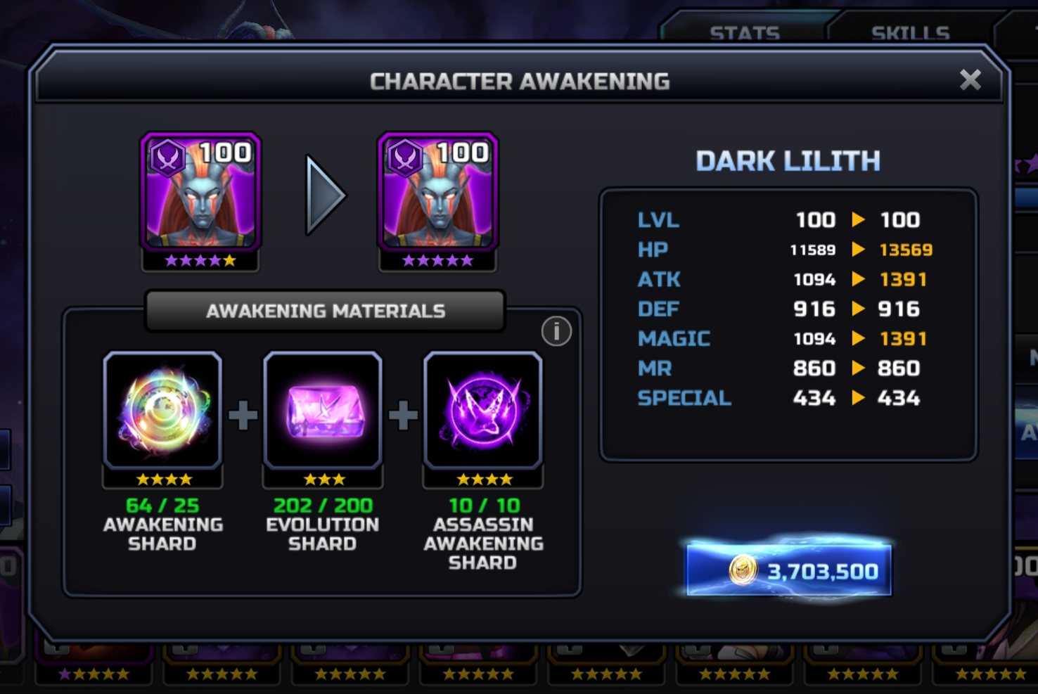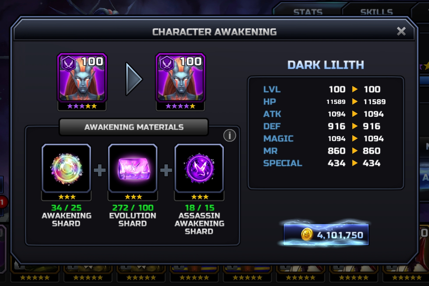 5. It takes 450 color-specific 3* evo shards to fully awaken a character. A lot of players probably have a good hoard of these, especially red, blue, and green, due to the LoL 4* character fragment events over the years. But, purple and yellow will generally be a weak spot for most, if not all, players. In addition, while many players can use their existing hoard to awaken these first awakenable characters, it won't be long before these 3* evo shards become a real bottleneck. I needed to farm for my last 30 for Dark Lilith, and it took 13 SoT refills on LoL X to get them all. Assuming this is generally representative, we're looking at about 200 SoT refills on a specific class of LoL X per awakenable character as the run rate (once hoards are spent) - read that again: 200 refills. This assumes that we don't get any other future sources of these shards. We likely will, as is usually the case with new features and materials (e.g., cosmic evo materials are much more plentiful now than a few months ago). But, this just illustrates the importance of that and the value of these shards in the meantime. For the foreseeable future, consider burning any excess SoT ("what's excess SoT?!") in LoL for awhile, especially when Gunner and Assassin are open.