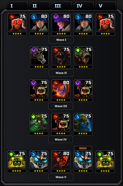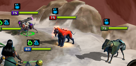Wave 2 - This is where my only two defeats (in hundreds of runs) have come from. The Purple Dog's power attack can give the whole team Endure, so you'll want to beat their team on the first turn. The Green Dog has the Block passive, making it slightly harder to one-shot the whole team. Either Passive Disable, or use a strong multi-hit attack to get past the Block. Both Purple and Red Hound have passive Immunity.