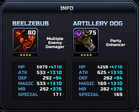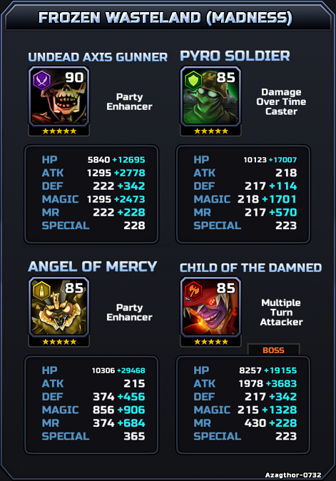 As befitting a HARD dungeon designed with newer players in mind, the enemies here are not overly difficult. They are all 4*, and either level 75 or 80. They might not have much HP, but they can hit surprisingly hard if you're not careful. They don't have any special talismans, and all have the same additional stat boosts, as shown below. The Frozen Wasteland has five waves, ending in a boss fight. However, despite Beelzebub being used in the official images for this dungeon, he is not the boss. That honour goes to the second blue bat.