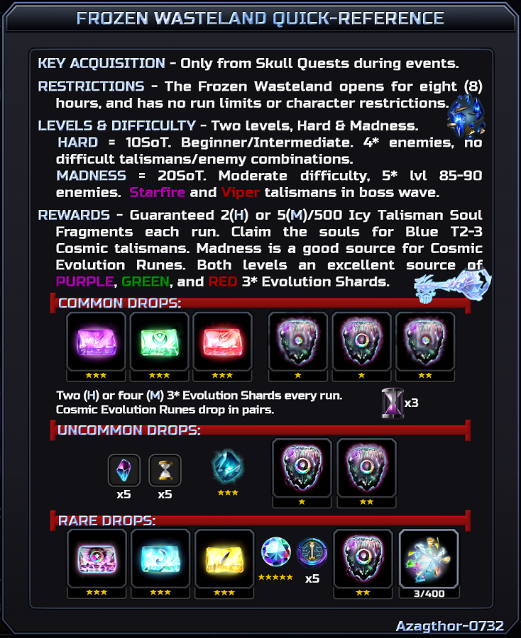 In summary, the Frozen Wasteland remains a good source for Red, Green, and Purple 3* Evolution Shards, all varieties of Cosmic Evolution Runes, and a decent source for Sands of War. Everything else should be treated as an extra bonus, and not expected.