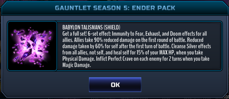 It's always a gamble what pressing the little (i) icon in te pop-up store will tell you, but for Ender Pack, it shows what Babylon talismans do. They're a 6-set, and look like they're going to be annoying to fight against.