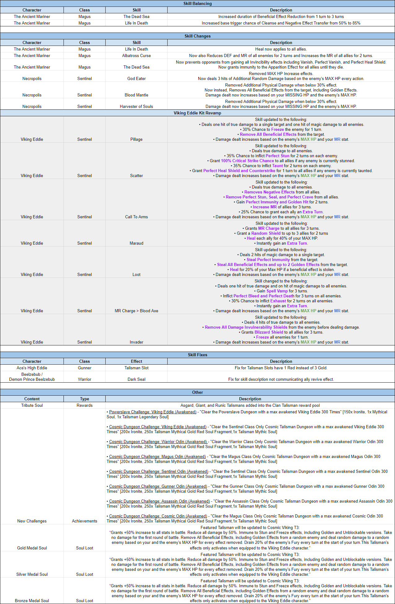 The following is the preliminary list of tuning changes that will go live in an upcoming update.