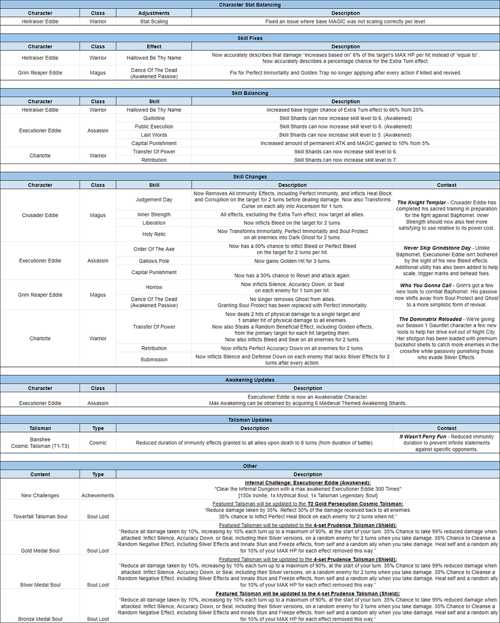 The following is the preliminary list of tuning changes that will go live in an upcoming update.