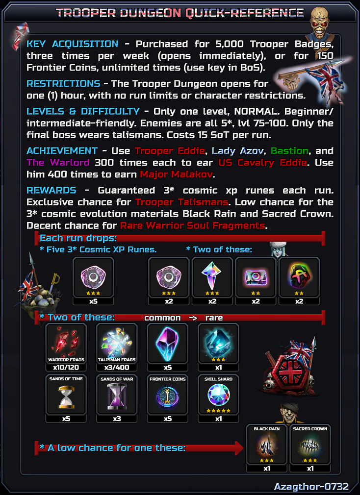 Welcome to the Trooper Dungeon guide. Arguably a dungeon which does not need a guide, but I’m nothing if not overly-detailed and needlessly verbose! Despite heavy editing, there are still a lot of words here, so I don't mind if you skip straight to the pictures. I've tried to include only the most relevant information in those. We'll dive right in with a Quick-Reference Image for you. You run this dungeon for the achievements, Trooper talismans, cosmic XP runes, and Black Rain.