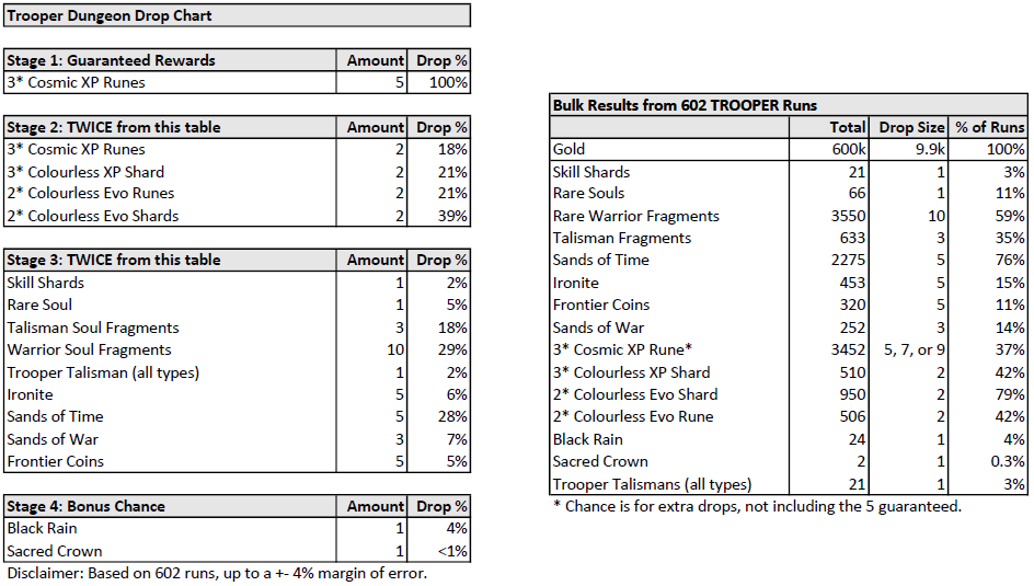 Still not completely sure how best to visualise our results but a simple chart is likely the simplest way for now. Anyway, here is how I believe the Trooper Dungeon's reward algorithm functions, along with my bulk drop data from 602 runs. Realistically, the bulk data is likely to be the more useful chart, as it shows roughly what proportions and numbers you might expect from your own runs over time. As always, RNG is RNG, and your experience may vary.
