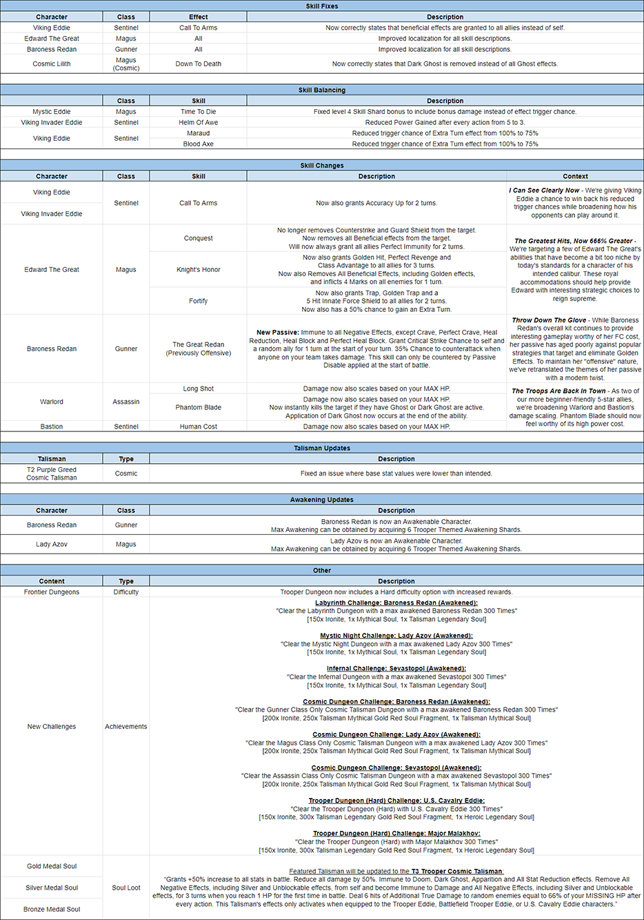 The following is the preliminary list of tuning changes that will go live in an upcoming update.