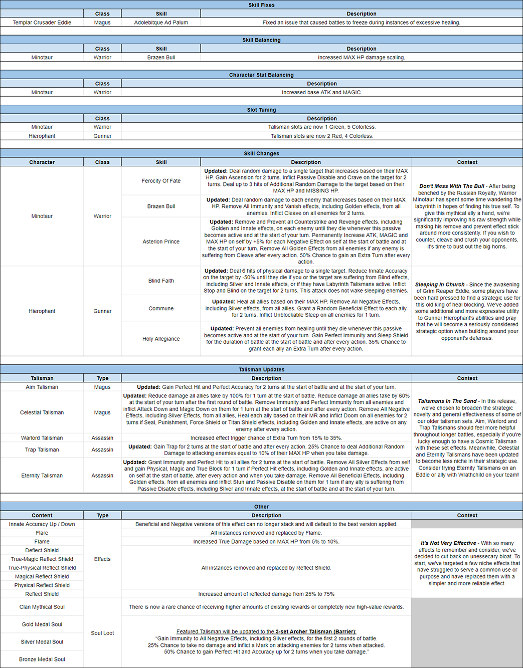The following is the preliminary list of tuning changes that will go live in an upcoming update.
