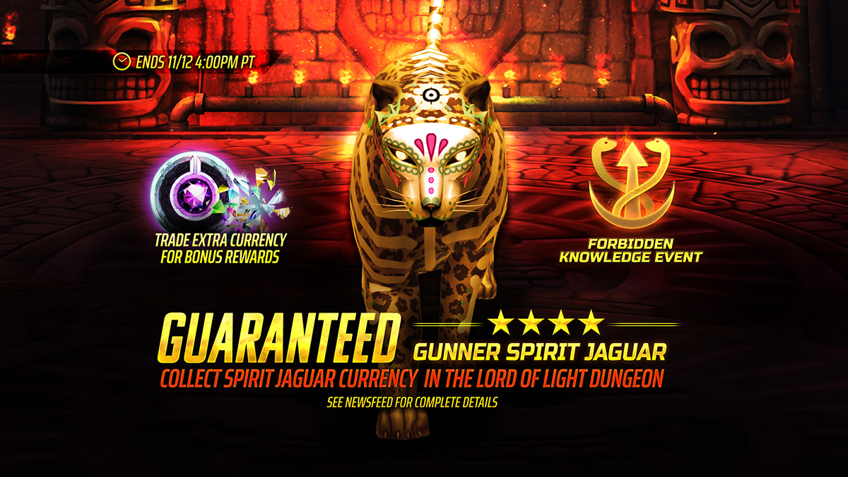 From now until November 12, 4PM PT, each battle in the Lord of Light dungeons has a chance of dropping Spirit Jaguar Currency. Collect 200 and you can redeem them in the Event Store for your very own 4⭐Gunner Spirit Jaguar!