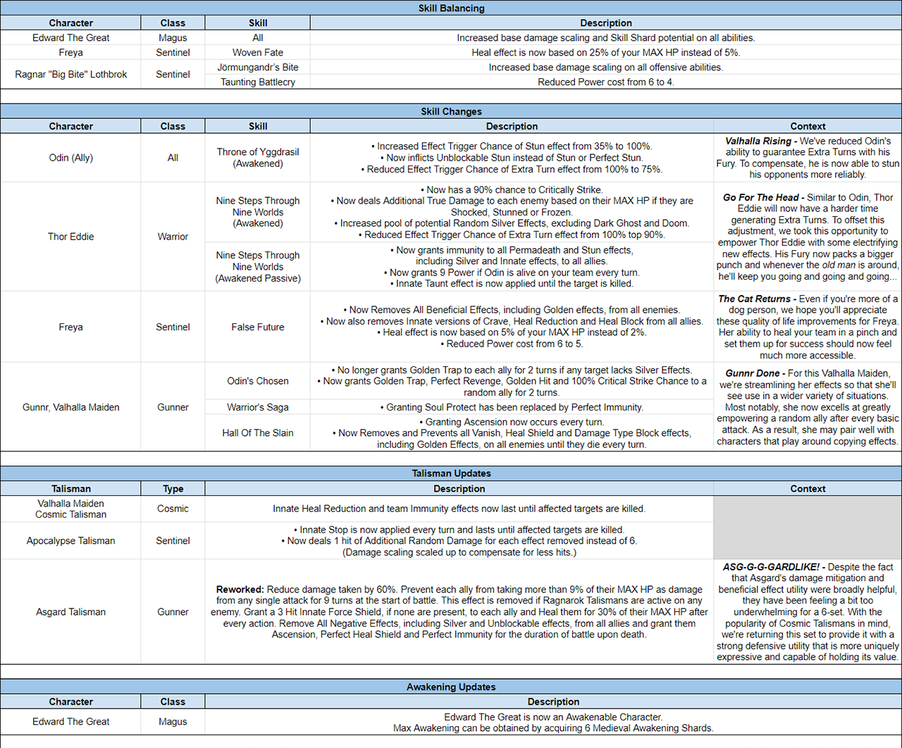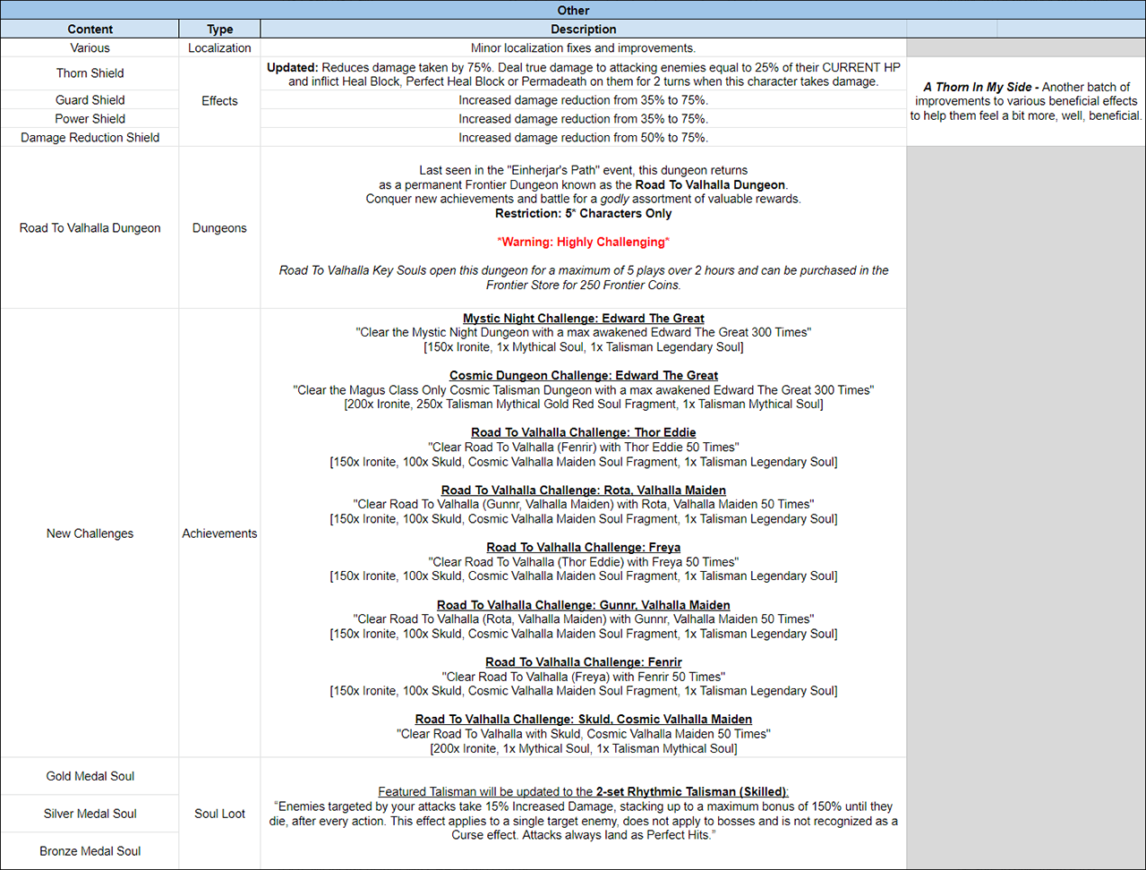 The following is the preliminary list of tuning changes that will go live in an upcoming update.