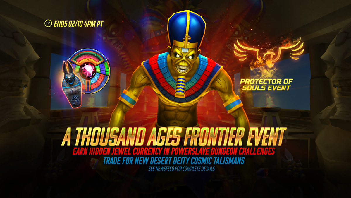 From now until February 10th at 4PM PT, complete Event Challenges in the Powerslave Frontier Dungeon to earn a variety of rewards, including Hidden Jewel Currency, Evo Materials, Absolute Darkness Currency and more!