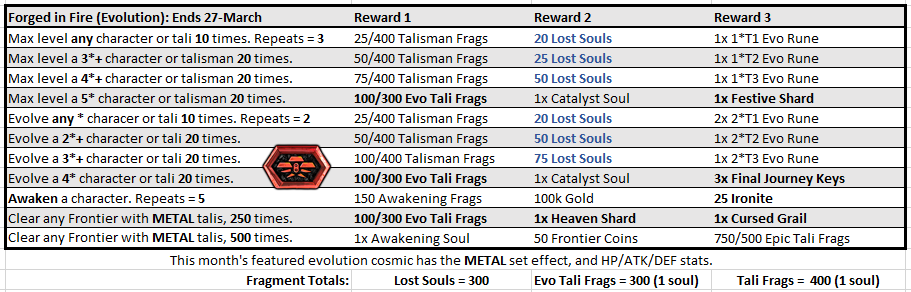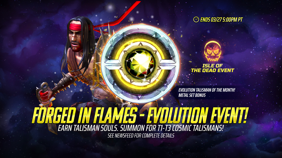 From now until March 27th at 5pm PT, complete Event Challenges by powering up and evolving your characters and talismans to earn a variety of rewards including Cosmic Evolution Materials, Talisman Soul Fragments and Lost Souls Currency.