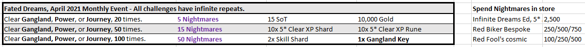 BONUS: For the month of April, Nightmare Currency will also be earnable through infinitely repeatable event challenges involving the Gangland, Powerslave and Final Journey Dungeons!