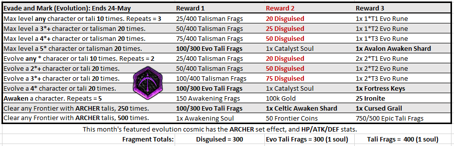 From now until May 24th at 5pm PT, complete Event Challenges by powering up and evolving your characters and talismans to earn a variety of rewards including Cosmic Evolution Materials, Talisman Soul Fragments and Disguised Currency.