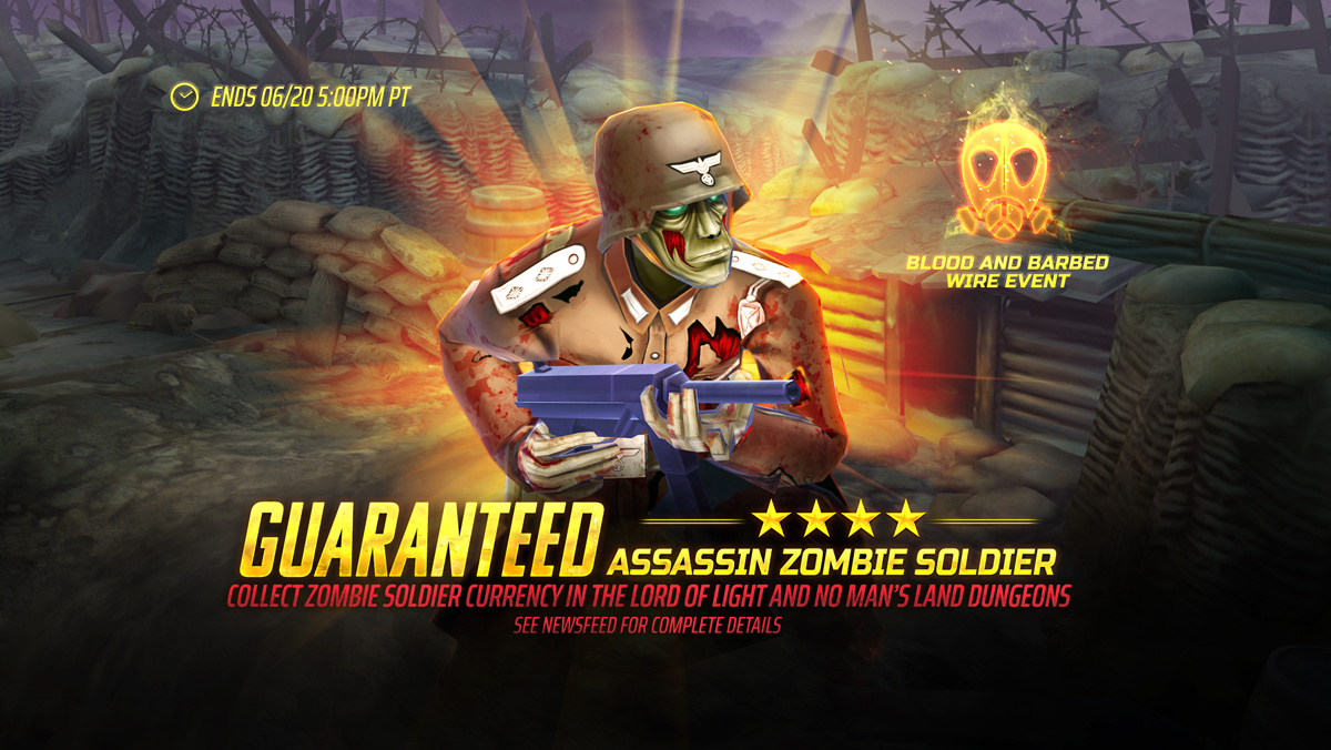 From now until June 20th, 5PM PT, each battle in the Lord of Light dungeons has a chance of dropping Zombie Soldier Currency. Additionally, battles in the No Man’s Land Dungeon are GUARANTEED to provide some Zombie Soldier Currency. Collect 200 and you can redeem them in the Event Store for your very own 4⭐Assassin Zombie Soldier!