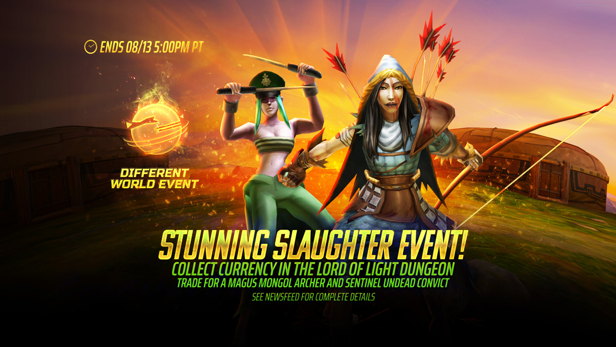 From now until August 13th, 5PM PT, each battle in the Lord of Light dungeons has a chance of dropping Concealed Weapons, the Stunning Slaughter event currency. Collect 200 and you can redeem them in the Event Store for your very own 4⭐ Magus Mongol Archer or 4⭐Sentinel Undead Convict!