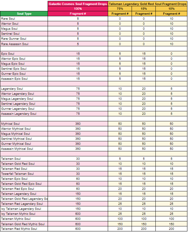 Fragments will be granted in the following amounts when the following Souls are summoned: