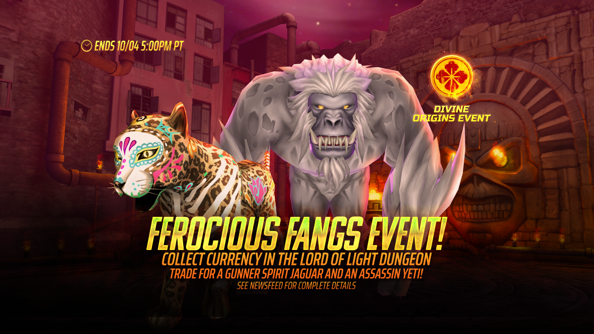 From now until October 4th, 5PM PT, each battle in the Lord of Light dungeons has a chance of dropping Sharpened Claws, the Ferocious Fangs event currency. Collect 200 and you can redeem them in the Event Store for your very own 4⭐ Gunner Spirit Jaguar or 4⭐Assassin Yeti!