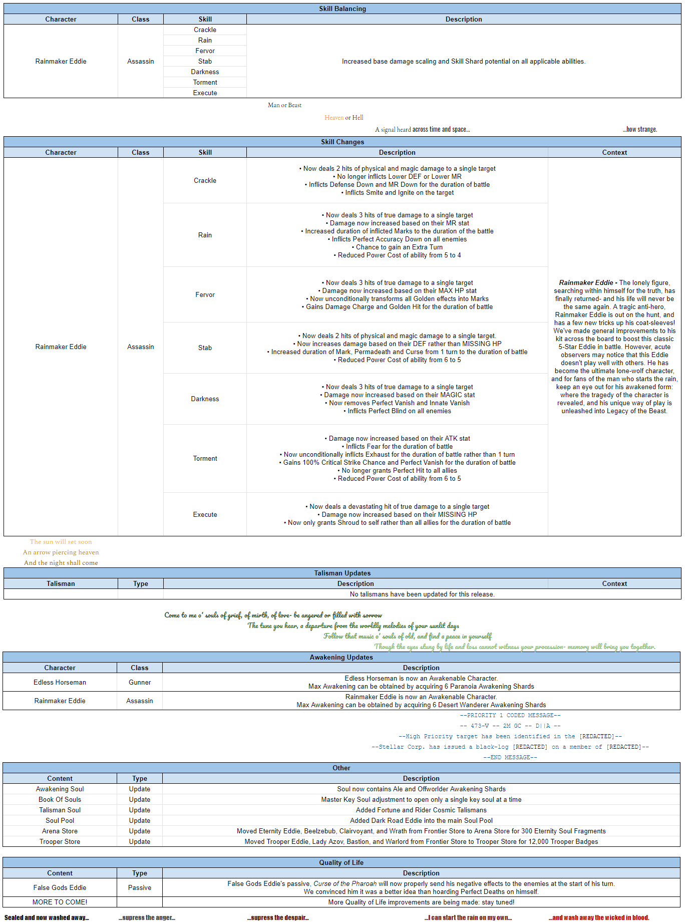 Here are the Preliminary Tuning Notes for an update coming at the end of this month! Important note: We've listed a number of quality of life fixes that you can expect in the next update. These are NOT live just yet. The quality of life changes will go live, along with the rest of the changes noted here in our next update, which is scheduled to take place in the final week of October. You can discuss the upcoming changes here.