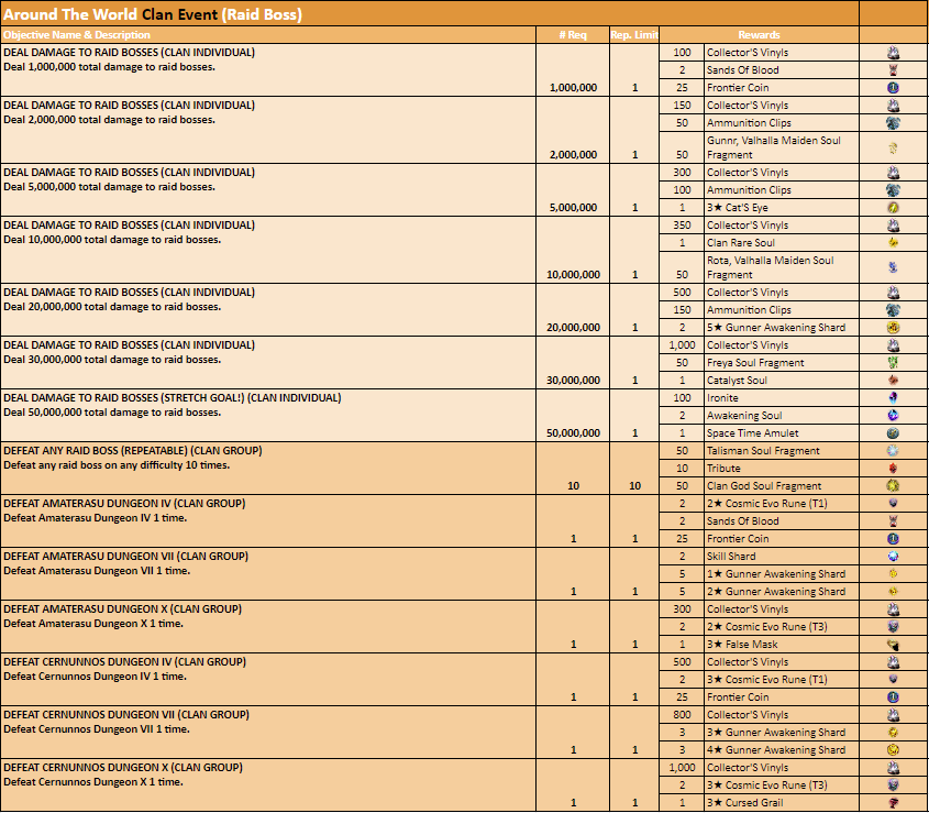From now until August 28th at 5PM PT, complete Clan event challenges in Raid Boss to earn rewards such as Collector's Vinyls, Gunner Awakening Shards, Ammunition Clips and more!