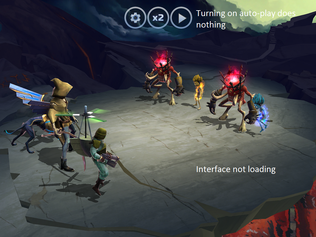 When I get to the 3rd or 4th battle on Number of the beast, the interface does not load. The auto-play button was viable, but nothing happened when it was pressed. The game is not totally frozen. The characters idle animations still play. This happens on all 3 difficulties on numerous attempts. I am able to complete other 5-stage levels such as "A Matter of Life and Death". Screen Shot below.