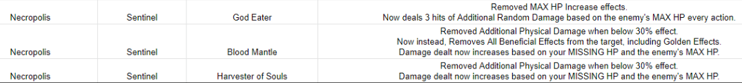 Necropolis' abilities were buffed in April's second major update. While doing a few runs for the Boss Rush event challenge, I was surprised how much damage Necro was dealing, as I remembered him being pretty weak in terms of damage dealing. Now he does several hits of decent damage, and removes all buffs. Coupled with his Viper talismans, he's now much more dangerous than before. He still has so much hp that Starfire-reflected damage doesn't help too much unfortunately. Perfect Death and P/Crave remain incredibly useful, as are Forge Talismans. Anything that gives you a reusable way of staying alive.