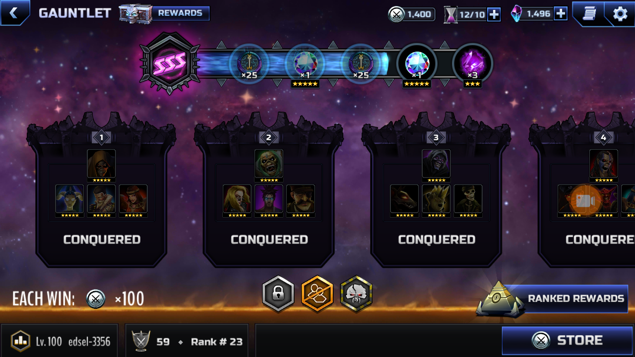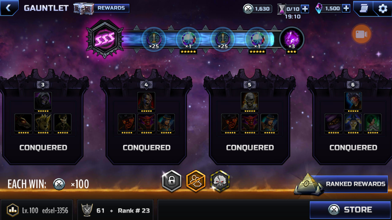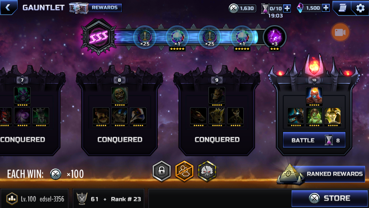 Ok... Gautlet is over for me until next reset. 11 battles in SSS, 63 victories and no more chances to win because of the amount of chars I've been using testing new combinations and talis equipped.