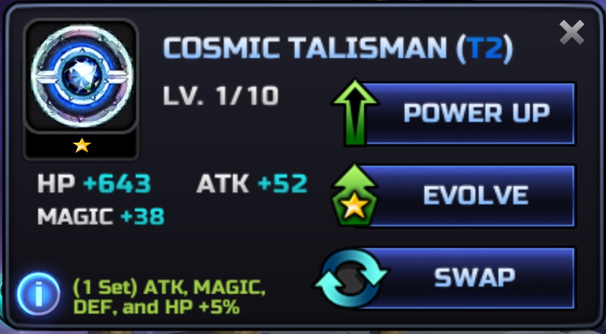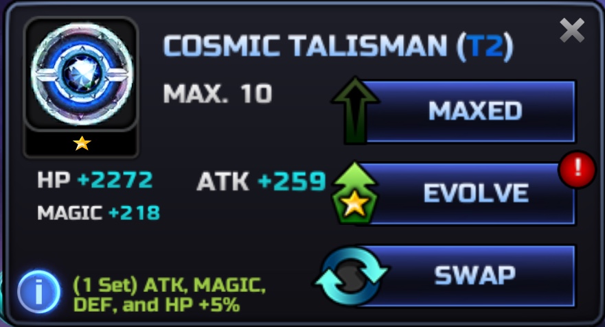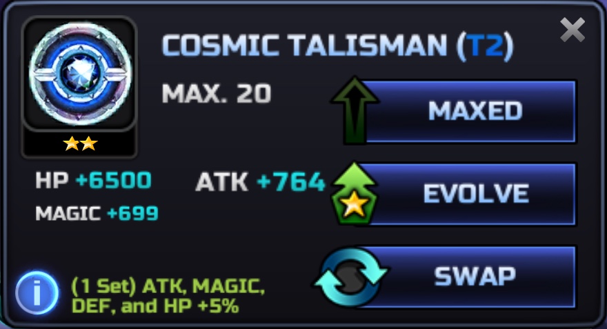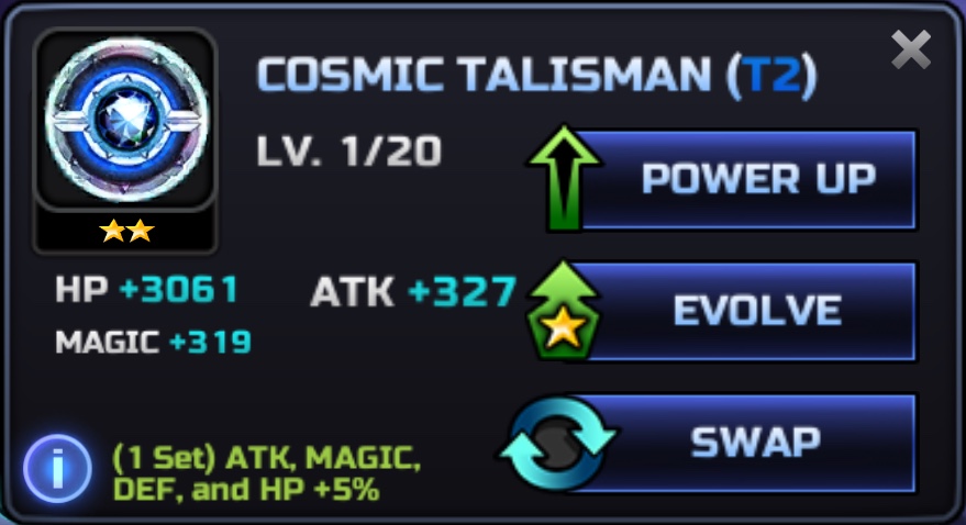 After 5 white T1 I got a blue T2. Maxed and evolved it from 1* Lv 1 to 2* Lv 20. It has ATK, MAG, DEF & HP + 15%. Every single stats can be seen on the pics below.