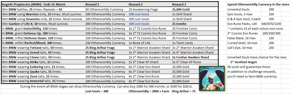 I was quite ambivalent about this event. I like events highlighting older parts of the game such as BNW and being able to farm the event currency was welcomed. The drop rates felt similar to what we expect from the regular LoL character fragment events (I've been getting roughly ~6.5 in BNW X and LoL XI recently), but the farming goals were much higher than a LoL event. While this was likely because there was a 5* character on offer instead of the LoL's 4* character and talismans, it was rather more daunting than expected. For the guaranteed 5* sentinel angel, in addition to completing all the event challenges, you would need to farm up to another 8000 currency. At the drop rates I was experiencing, this would have been ~1,200 BNW X runs, and around 3k ironite-worth of SoT. I didn't end up going for it in the end, decided the better use of my time was farming the mega-event dungeons.