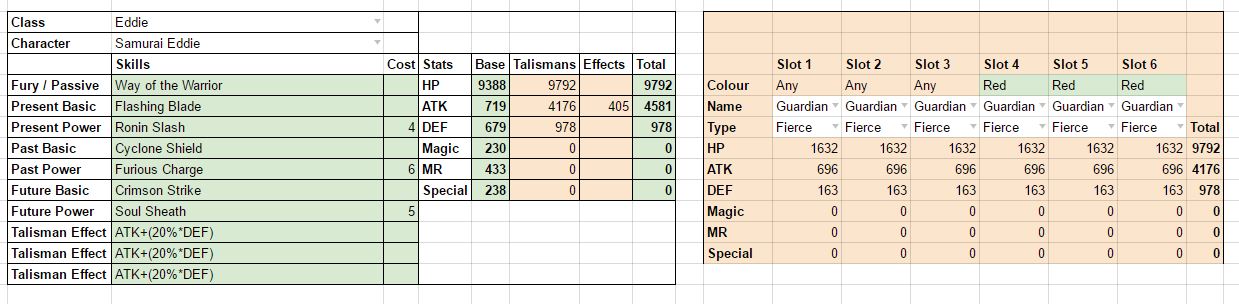 I recently pulled Samurai Eddie from rare soul. Put the 6x guardian fierce talismans (interesting that my Eddie has +4581 attack instead of the +4605) and made 107k critical on Beelzebub Madness. Circumstances for that huge hit: armor penetration from Eddie's Fury skill, Alliance General's Power skill buffs and warrior Soulless Demon's ATK increase buff.