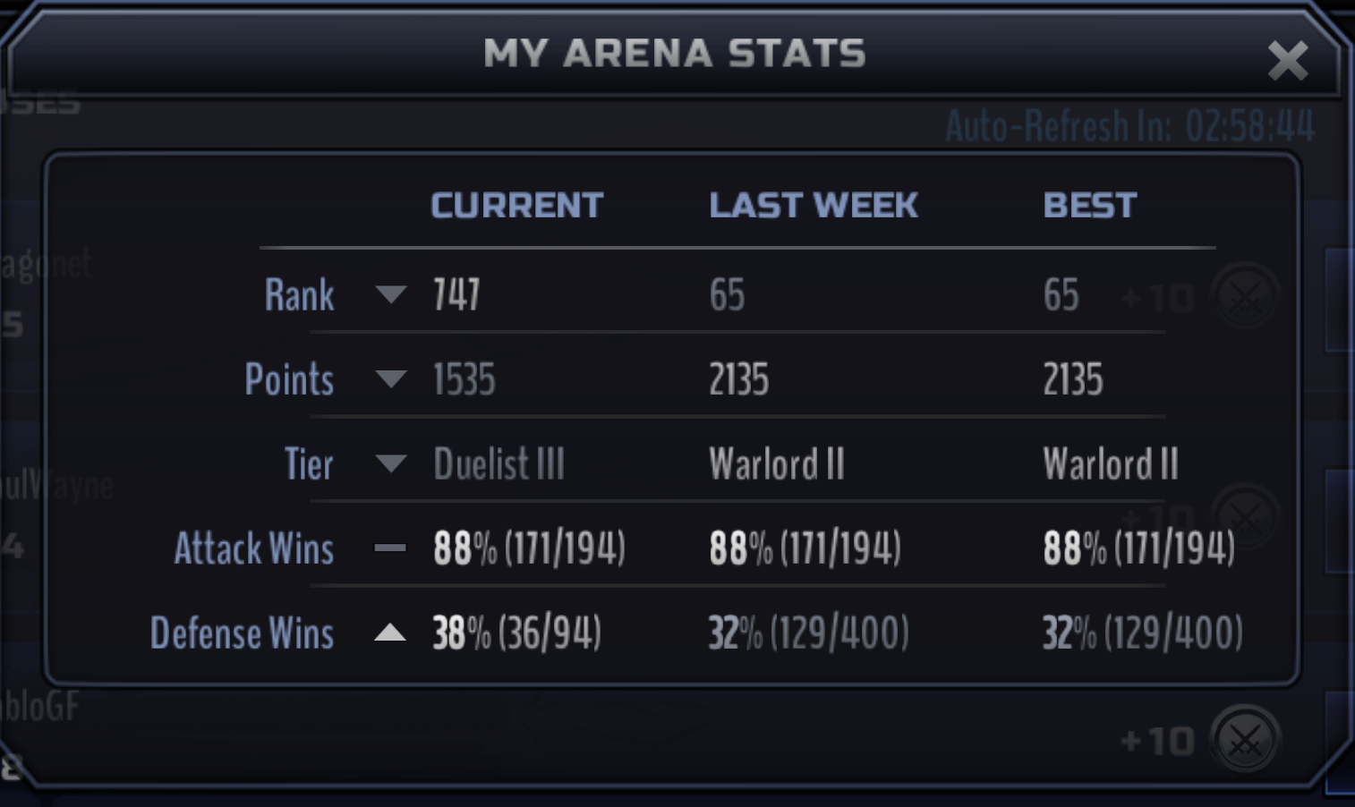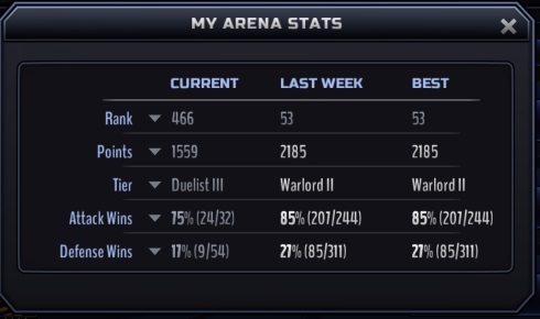 All this time I've been pretty happy/impressed with my skillz in PvP, considering the 5* players that I don't have (no Prisoner, no Troll, no CG, no Bats, and I'd rather remove a ball with a rusty fork than use Mummy, etc.) -- only to realize that both my win % and defense % are abysmal, and should realistically land me in the bottom 10% of players who have been playing as long as I have. I only achieved my rank due to not getting attacked -- and by refilling a shit load of SoW -- which really deflates some of the good feelings/fun I am having. FWIW, I feel bad that I just got lucky, while some of you, who are by far superior players, got bent over. It's like Obama's left leg; it ain't right.