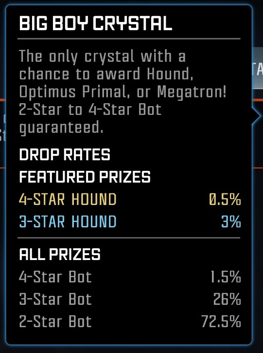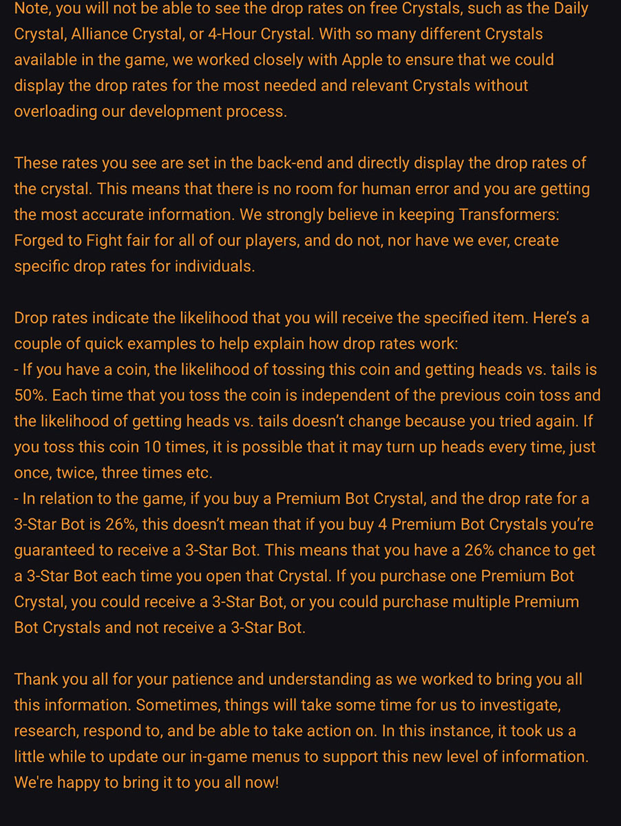 Thought I would share something from a chat in discord. It's information from Transformers: Forged to Fight on drop rates. Hopefully the guys from there don't mind me sharing this. The hope is that this gives people an idea of what drop-rates are in a game that uses this method for getting new characters. While it would be nice for NF to post some actual numbers as Amarthir stated it won't change the odds being what they are.