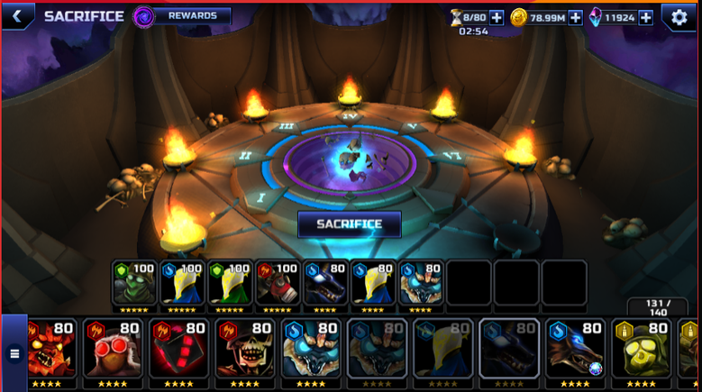 -Angel of Pain, Angel of Strife, Sentinel Pyro Soldier, Warrior Troll, The Wicker Man, Rocket Dog and two Magus Golden Sons. Those were all 4*. Two of them were level 80, one in each sacrifice, but I can't remember which ones as I did that just before the sacrifice to get enough essence. The rest of that bunch were level 1. I do not remember which went into which sacrifice.