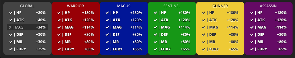 But here's a cumulative chart (meaning the global boost is ADDED to the class boosts)...