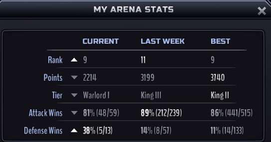 OK, I tried something different this week, Fought every battle with the same offense this week...except one battle with a team that is kicking my ass... lost again even worse... I will figure that one out later.
