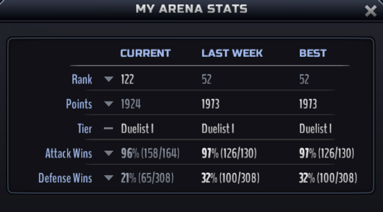 exactly what you mentioned happend to me and many others. i'm stuck at 1900 points since monday! sure my defense dropped from 32% to only 21% that's definetly a big problem. but nontheless i played all "natural" sow and won 96% of all matches. most of them for 18+ points, but i'm still not able to get anyway near 2100 or even 2300 points. and the big rush will start tomorrow. i think many player suffer from this. so basicly there is no reason to play, if i don't want to spent huge amount of ironite. i bet you know who sisyphos is, because this is the pecfect example for a sisyphos work. the stone rolles down again and again.