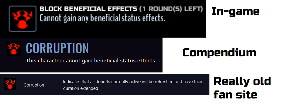 Corruption is the new name for block beneficial effects before silver versions of most effects existed. Its an obsolete effect because only old school characters can apply it. Most newer characters do perfect corruption. The compendium shows that SOL applies corruption but in game his future basic says applies block beneficial effects. If you look at the effect in battle it is the same symbol as what the compendium calls corruption, but even in battle it says block beneficial effects. Just another example of the lack of attention to detail with this game.