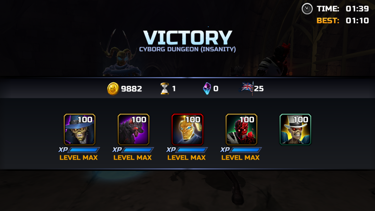 As for tali's, you're right, I don't have Orbits and I'm also missing a couple of other key sets that have been recommended for various events in the past. I ended up running through a couple of dozen BNW purple/blue dungeons so that I could upgrade those Forge tali's and was able to get 3 of them up to 5* with the other 2 at 4* and instead of the Vipers I took a chance on Valor for the W.LoL. Those are mostly still 3* and I mainly wanted to get an idea of how useful they would be, with LoL being tier 10 I hoped the damage would kind of equalise but he was doing very little in the end. The effect though was spectacular, between those 2 characters it took care of almost all the challenging buffs instantly.