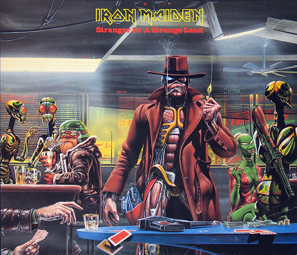 Riggs renders the cyborg Eddie as Clint Eastwood’s Man With No Name, lighting up a cheroot as he strides menacingly into a bar inspired by the Mos Eisley Cantina from Star Wars, disrupting a card game that offers another Maiden art cameo for the Grim Reaper. Beautifully painted and hugely involving, even Riggsy himself seems pleased with this: “I got some time to do this one so I got to do some decent painting… so it looks better than some of the others,” he modestly posits on his website (adding “I like green girl, green girls are hot”).