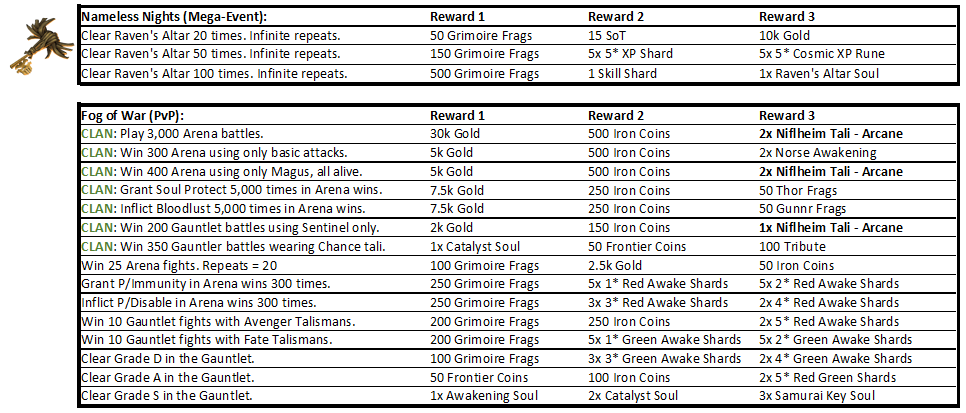 Rewards include various Awakening Shards, Thor Eddie Fragments, Valhalla Maiden Fragments and new 5-set Niflheim Talismans.