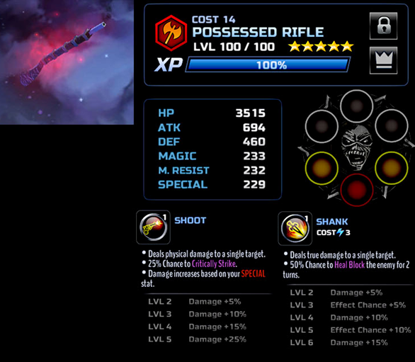 HP - One more sincerest apologies to Gunner Sandworm again. Because the big brother Possessed Rifle is sharing the oscar for having the LOWEST HP IN THE GAME WITH IT'S BROTHER! 3515 at 5* LVL 100. If you want best lowest HP characters in the game, look no further than this flying guns!