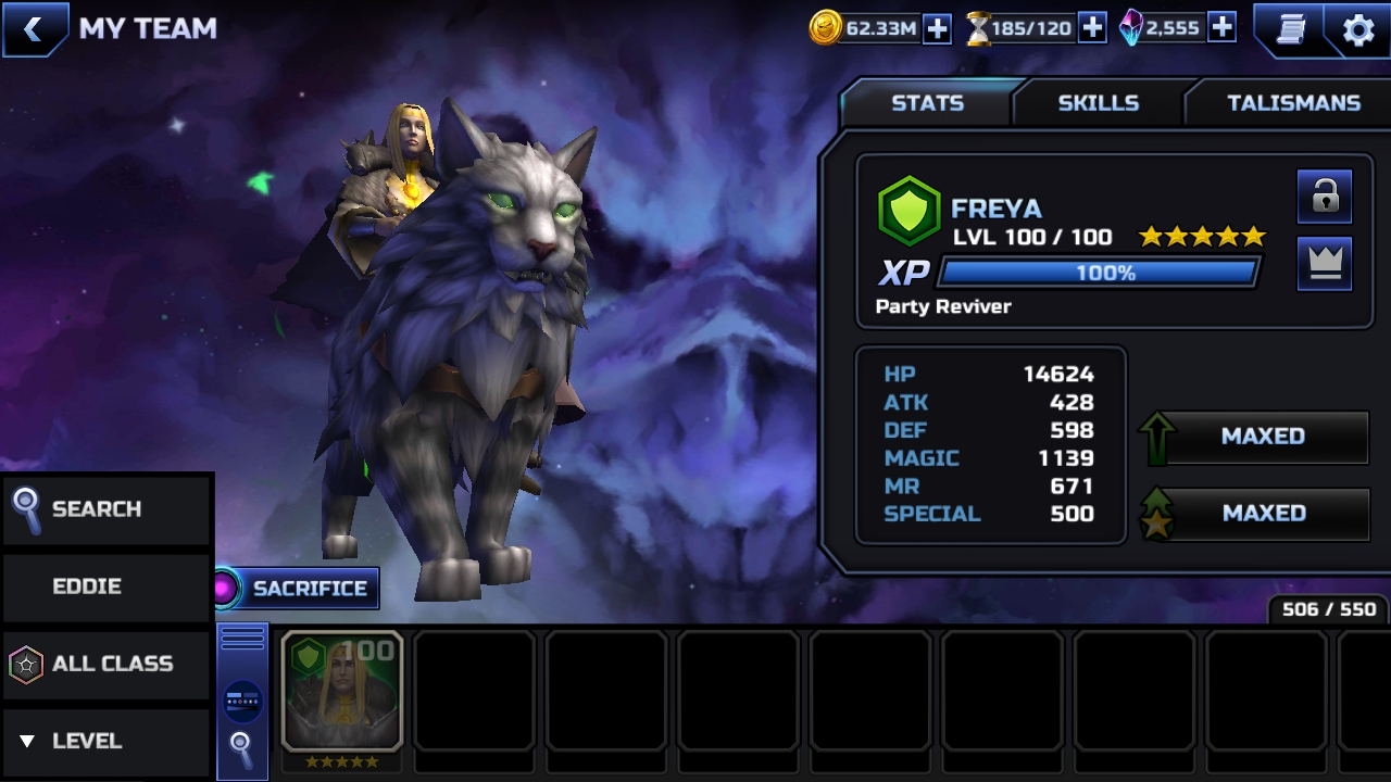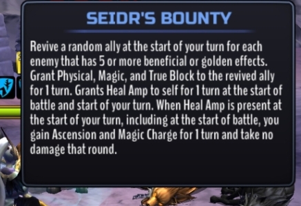 Freya is a 5★ Sentinel who rides into battle upon her trusted Skogkatt. This noble goddess protects her team from harm by healing with each of her attacks, and removing enemy shields. Her passive ability Seidr’s Bounty will revive a random ally at the start of the player's turn for each enemy that has 5 or more beneficial effects on them. Freya will also grant Heal Amp to herself at the start of battle, and the start of your turn!